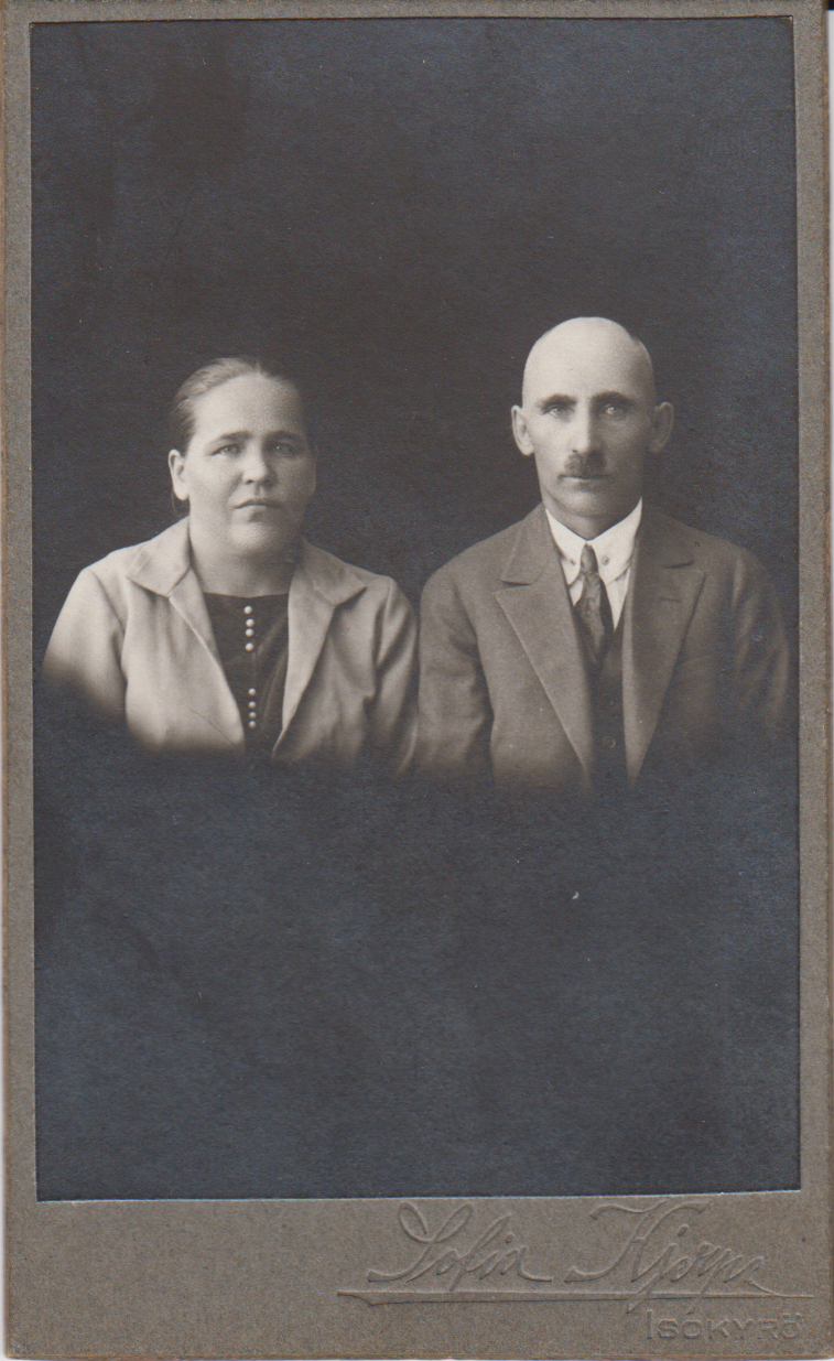 Image Lataa täysikokoinen kuva Huomioi julkaisuoikeus! Kuvan lisätiedot Kuvassa on Yrjö Mäkelä ja vaimonsa Agafia, o.s. Loginov, vuokkiniemeläisiä molemmat. Kuva on otettu Sofia Hjerpen valokuvaamossa Isossakyrössä 1930-luvun puolivälissä. Tiedot Kuvakokoelma Tunnistettavat valokuvat Asiasanat pariskunnat | henkilökuvat | tunnistaminen Paikat Nimi Isokyrö